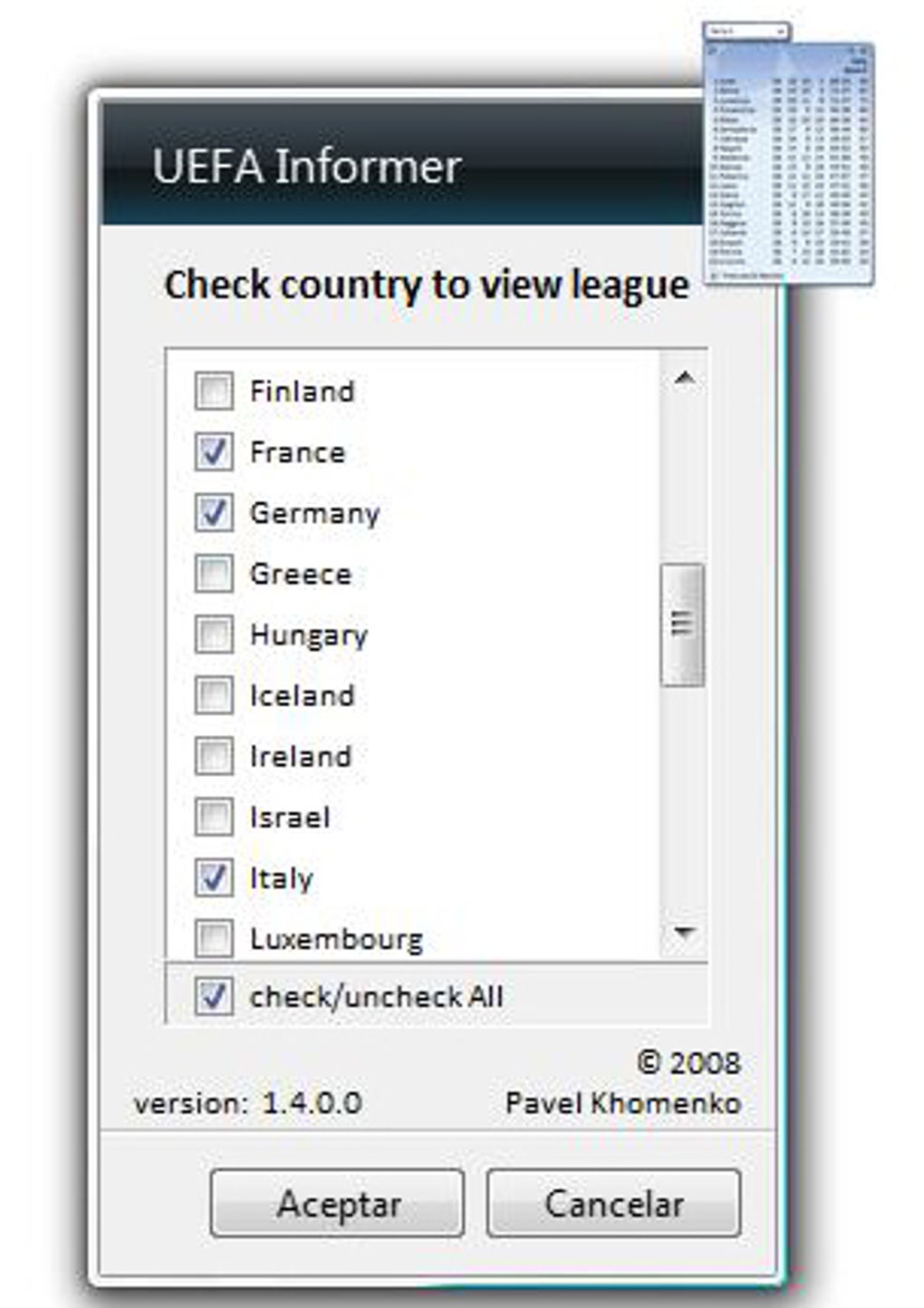 UEFA Informer Gadget es un gadget que te informará de los resultados de las competiciones de fútbol más importantes del mundo directamente desde la barra lateral de Windows Vista.